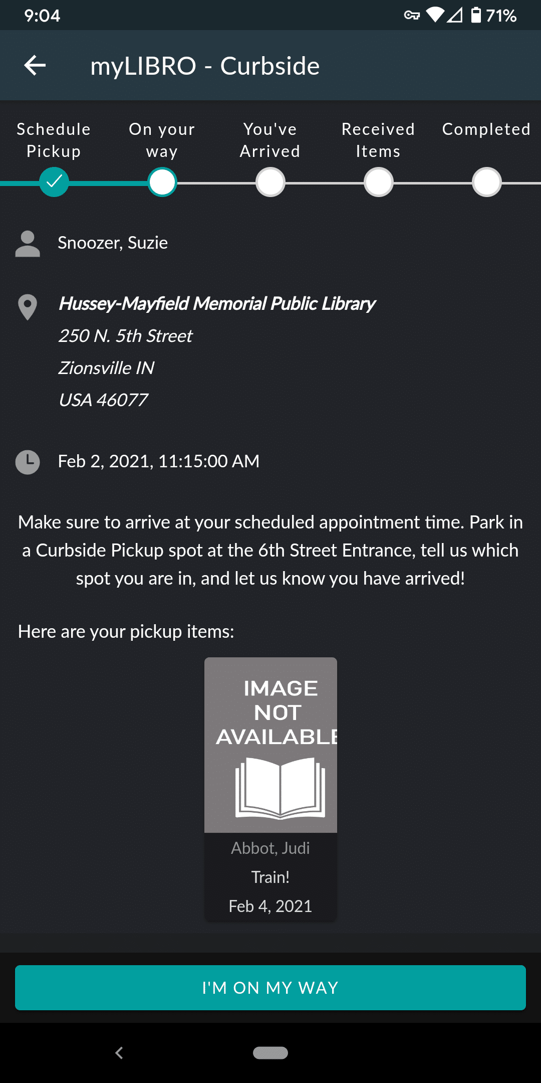 - If you accidentally tap “I’ve received” before getting your items, just give us a call at 317-873-8340 to speak to a friendly Library staff member